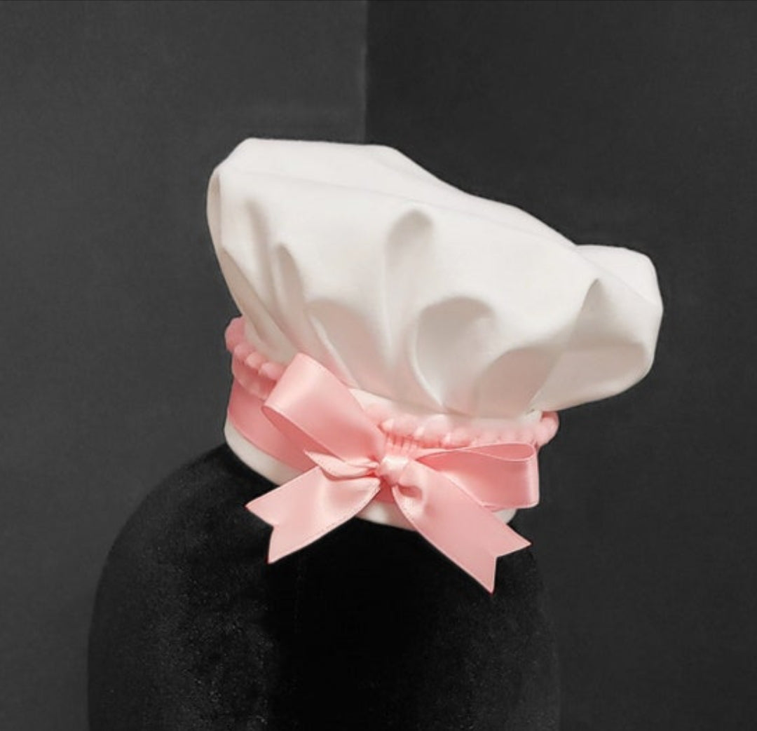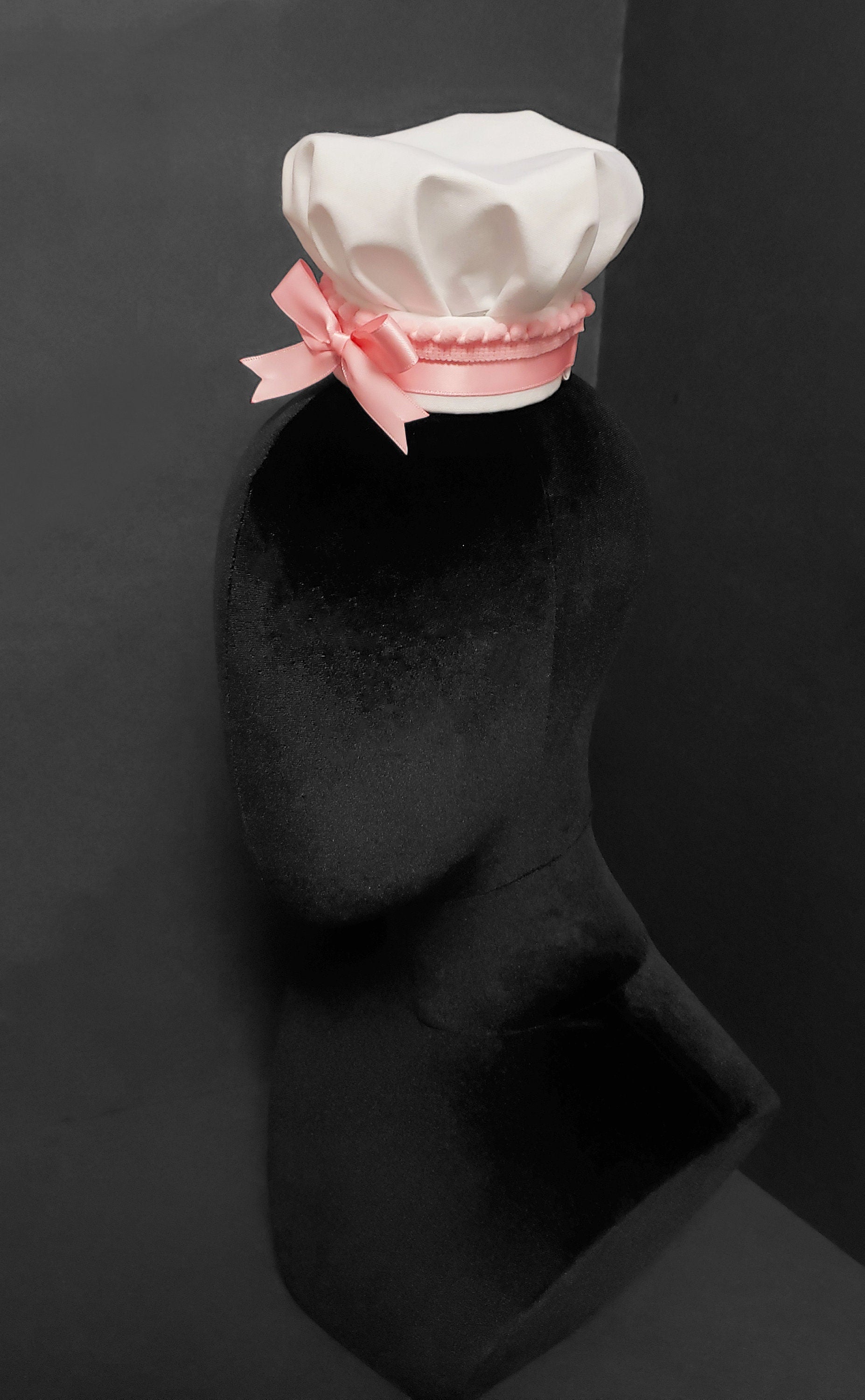 This is a Bakery Sweet mini pastry chef hat made from my own pattern design. It is made of a pure white cotton fabric over an interfacing base with a white cotton fabric puffed top. The base of the hat is embellished with a satin ribbon, a mini pink pom pom trim, and satin ribbon bow hand sewn to the side. The piece fastens with two alligator clips handsewn to the underside.