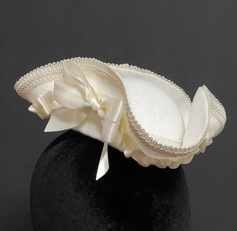 This is a white and ivory wedding mini tricorn pirate hat, perfect for Pirate Lolitas and pirate weddings! It is made of a hand molded white wool felt with a hand pleated ivory double face satin ribbon trim hand sewn around the entire piece. The brim and base of the hat are lined with a ivory braided gimp trim with a hand sewn ivory double faced satin ribbon bow. The piece fastens with either two alligator clips secured to the underside or a black satin headband.