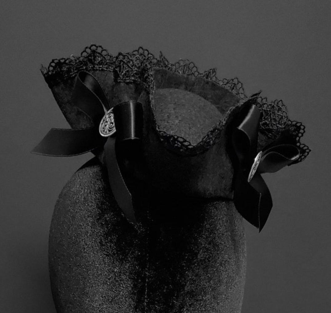 This is a black mini ruffled tricorn pirate made of a hand molded wool felt with a black venice lace trim handsewn around the entire piece. The base of the hat is lined with an black braided gimp trim with handsewn black double faced satin ribbon bows, embellished with metal filigree buttons. The piece fastens with either two alligator clips secured to the underside or a black satin headband.