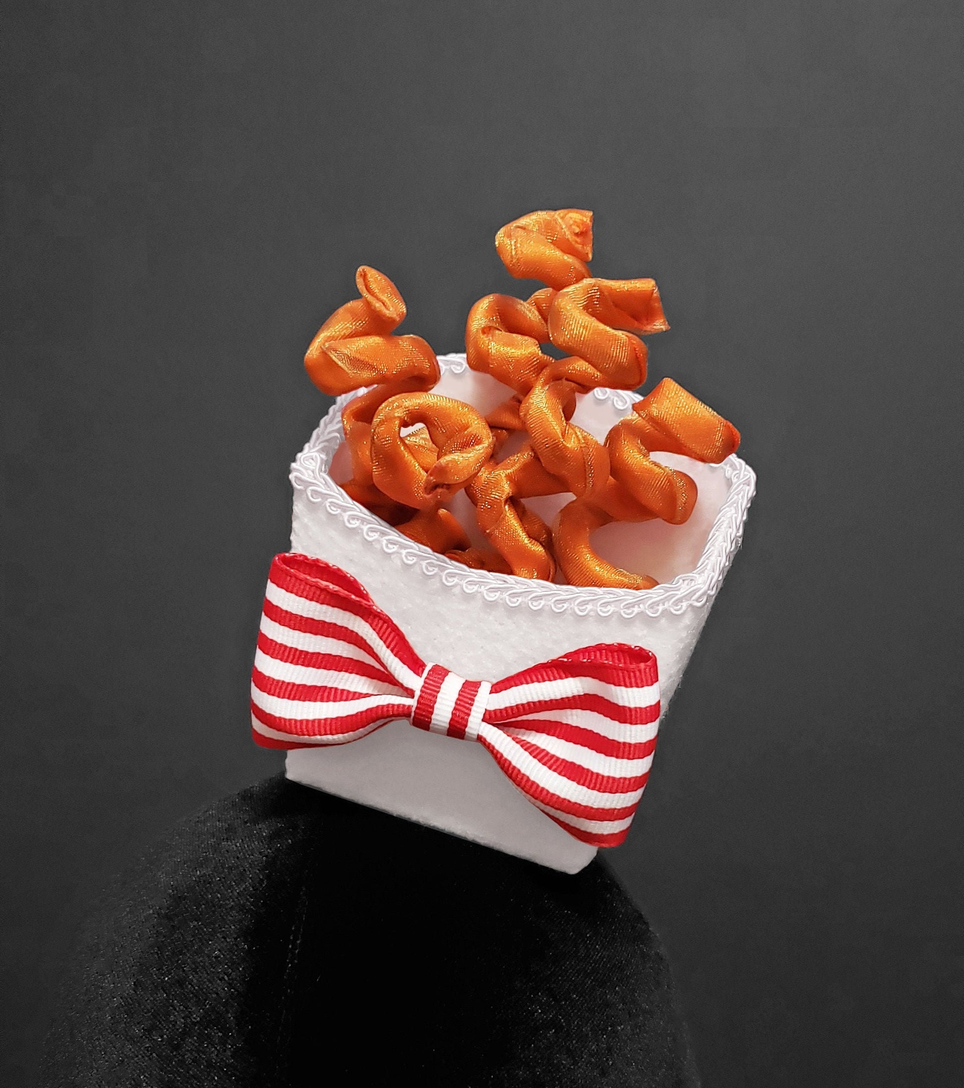 These are State Fair curly fries designed and made by me! There are made of orange satin ribbon and gold sheer ribbon wrapped chenille stems that have been twisted into each fry <3 The fries are attached into a hand made white felt fry box, lined with a delicate white braid trim, and embellished with a red and white stripe bow. The piece can fasten with two alligator clips secured to the underside, a black satin headband, or no fastening for desk decor.