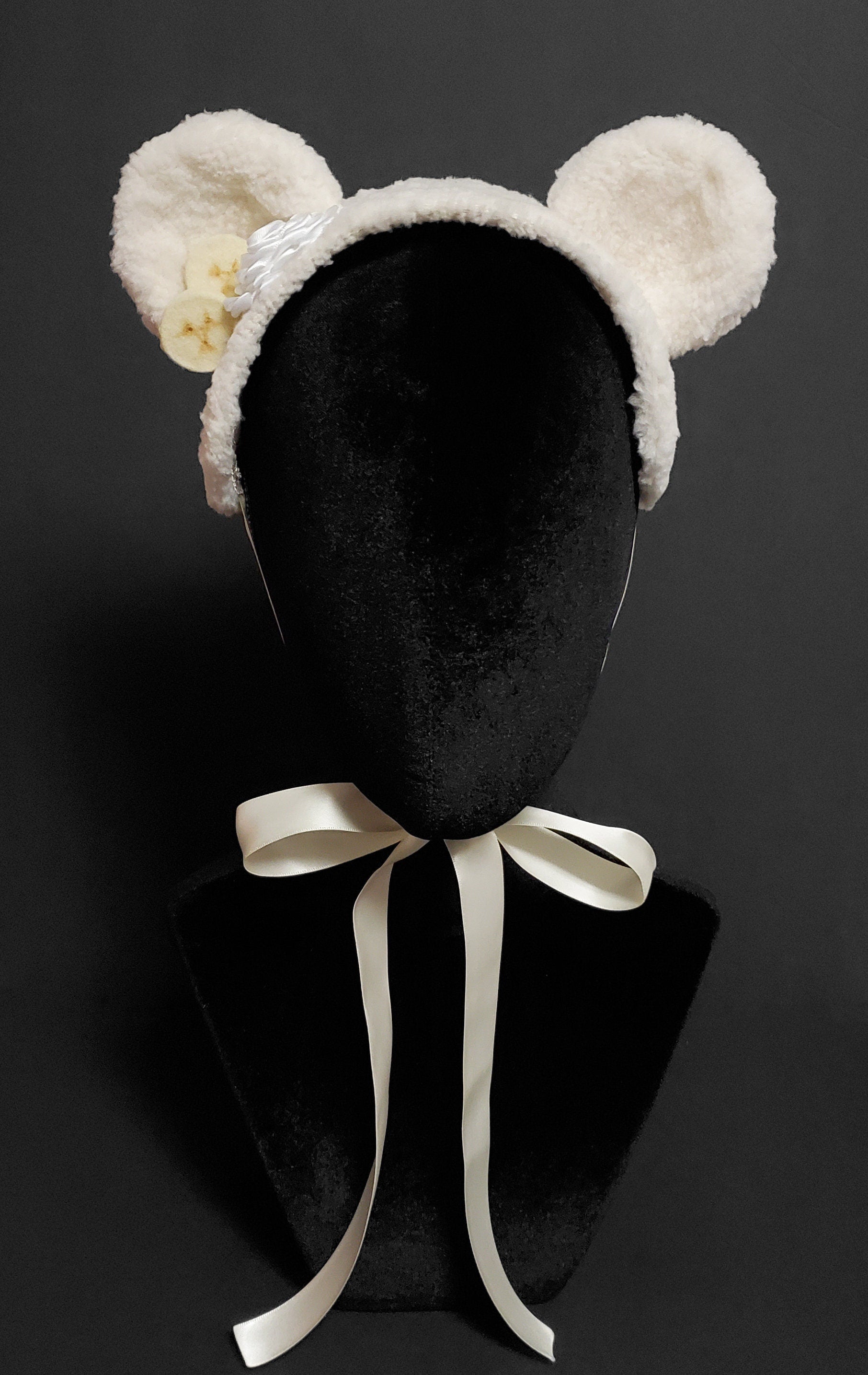 This is an ice cream bear headdress designed and handmade by me. It is made of a plush pastel yellow fabric and a ivory cotton fabric underside with white braid gimp trim. The bonnet is embellished with plush bear ears and hand made felt banana slices hand sewn to the base with a white satin ribbon whipped cream dollop. The piece fastens with either a ivory double face satin ribbon or a black satin headband.