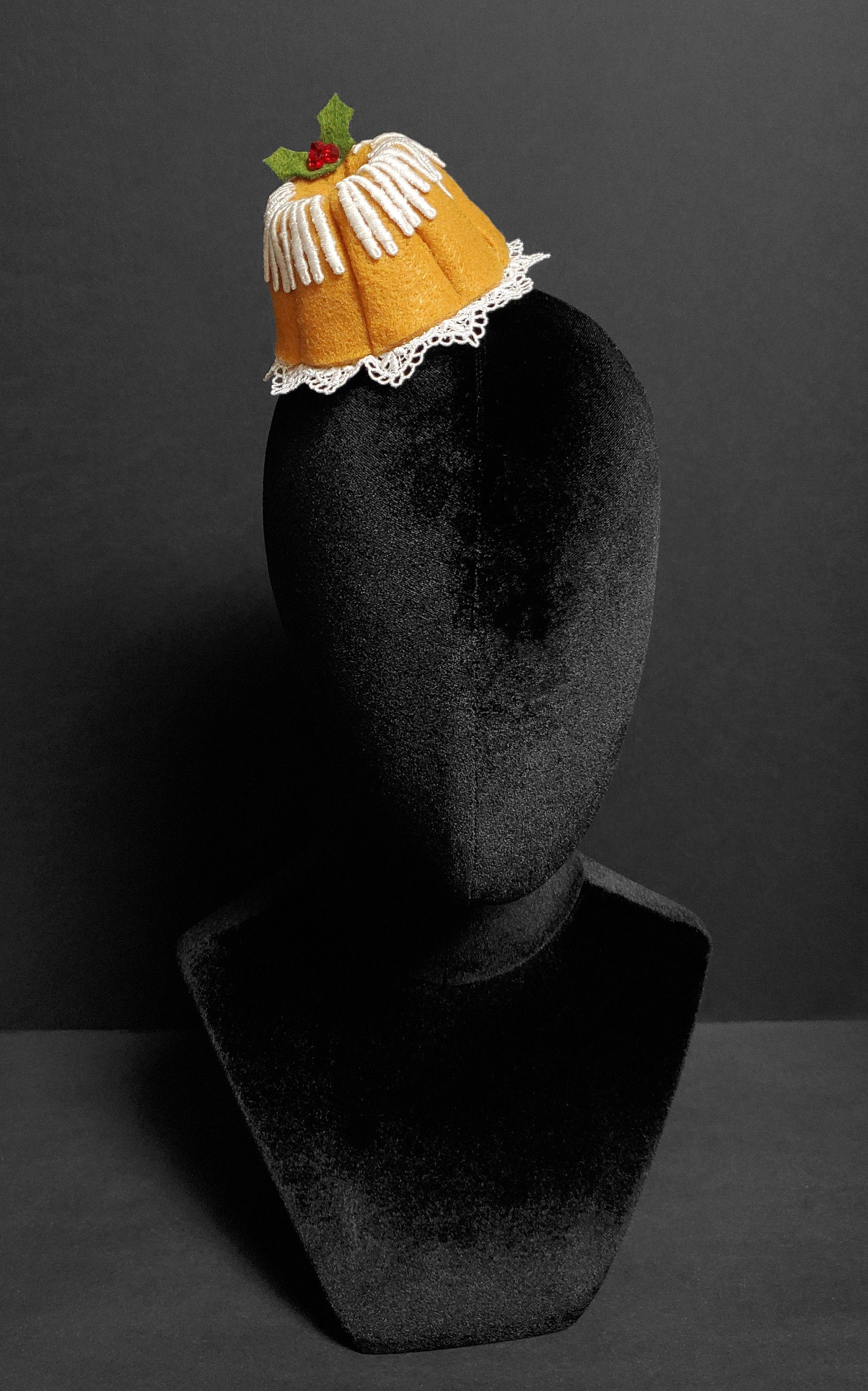 Absolutely scruptious! This is a Christmas bundt cake barrette made from my own design. It is made of a golden bundt cake brown wool felt with white venice lace frosting drips and white lace trim plate. The cake is embellished with hand sewn green wool felt holly leaves and red crystal berries. The piece can fasten with two alligator clips secured to the underside, a black satin headband, or no fastening for desk decor.
