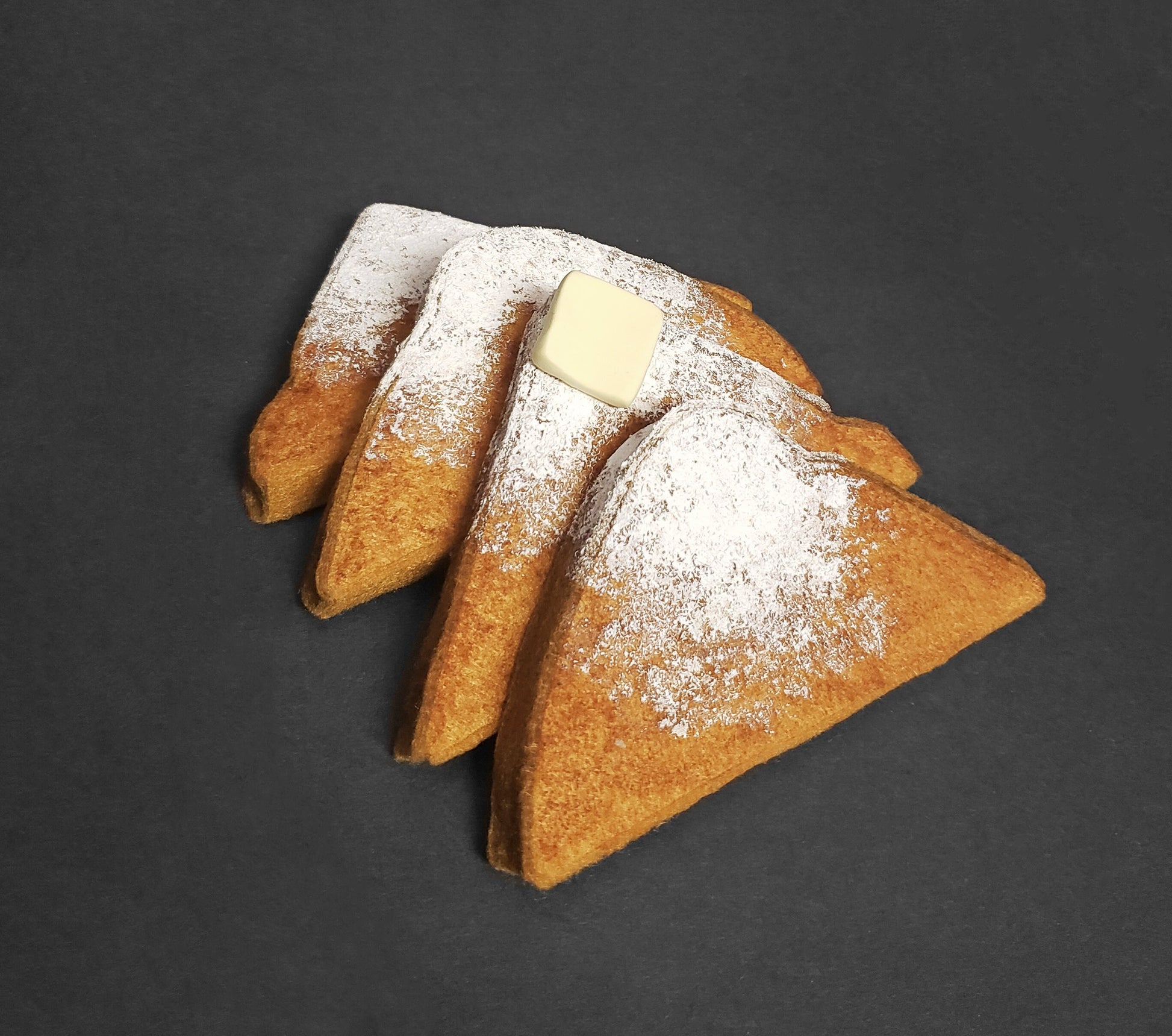 This is a sweet french toast fascinator designed and made by me. It is made of felted plush french toast triangles hand sewn together strongly yet allowing for flexibility. The french toast is embellished with an inked toasted color, white acrylic paint powdered sugar, and a foam clay butter pad in the center. The piece can fasten with two alligator clips secured to the underside, a black satin headband, or no fastening for desk decor.
