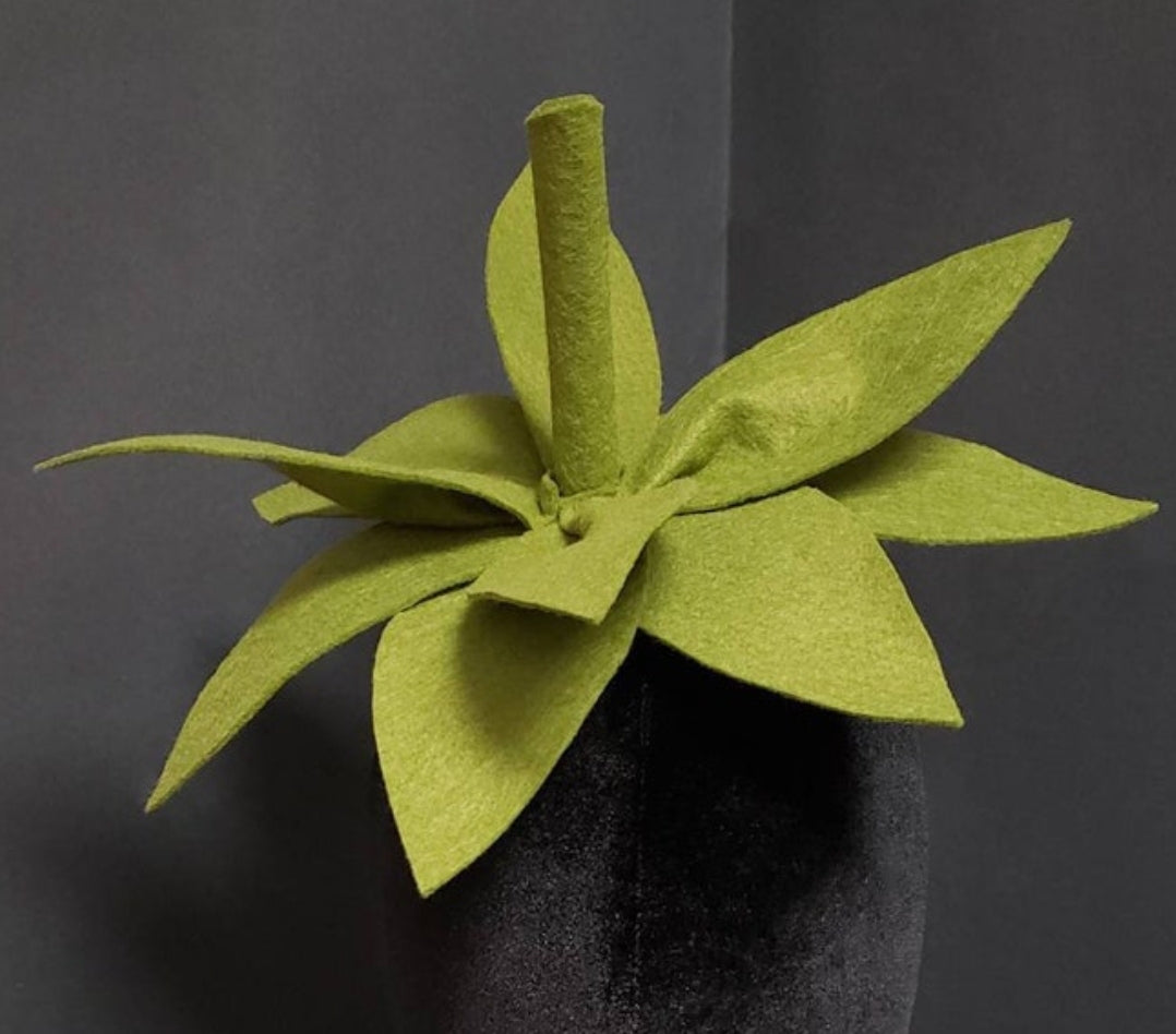This is a green leaves strawberry top fascinator designed and made by me. It is made of a green wool felt covered interfacing base with wired green wool leaves and stem. The piece fastens with either two small alligator clips secured to the underside or a black satin headband.