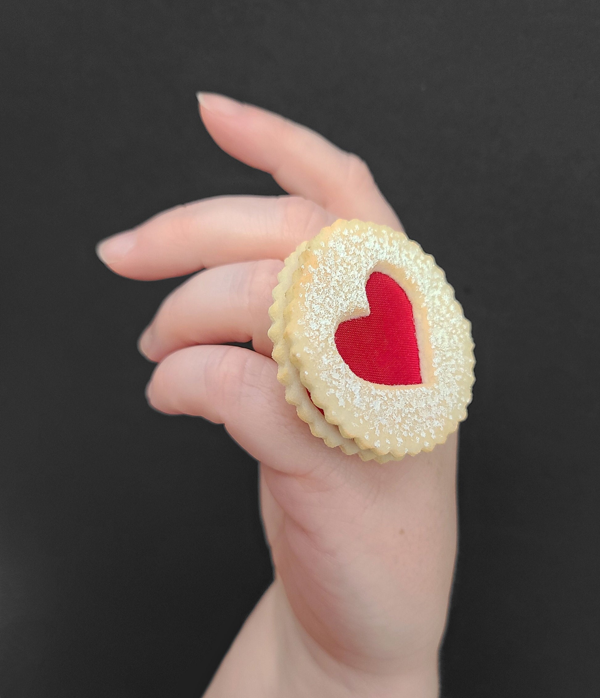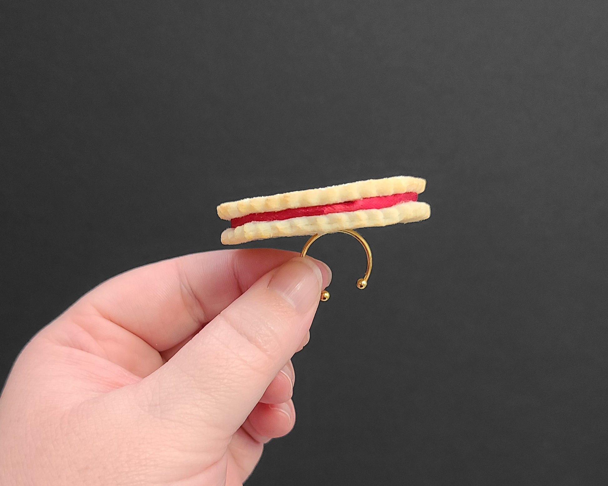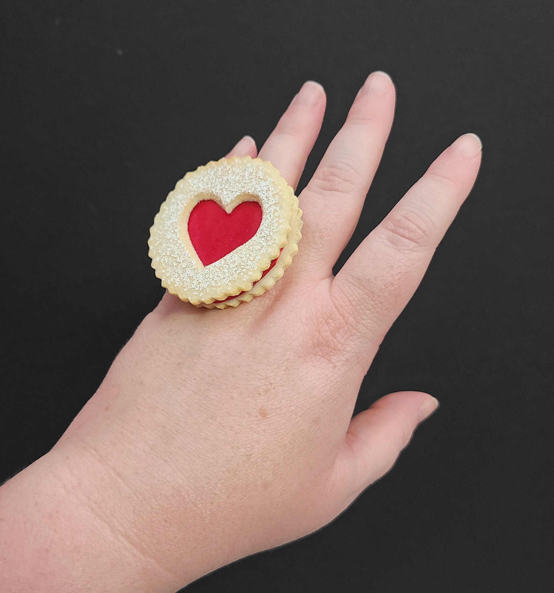 This is a Linzer heart cookie ring designed and made by me! It is made of felted cookies with a satin jam or chocolate center, and topped with hand painted powdered sugar. The piece is fastened to a gold plated adjustable ring.
