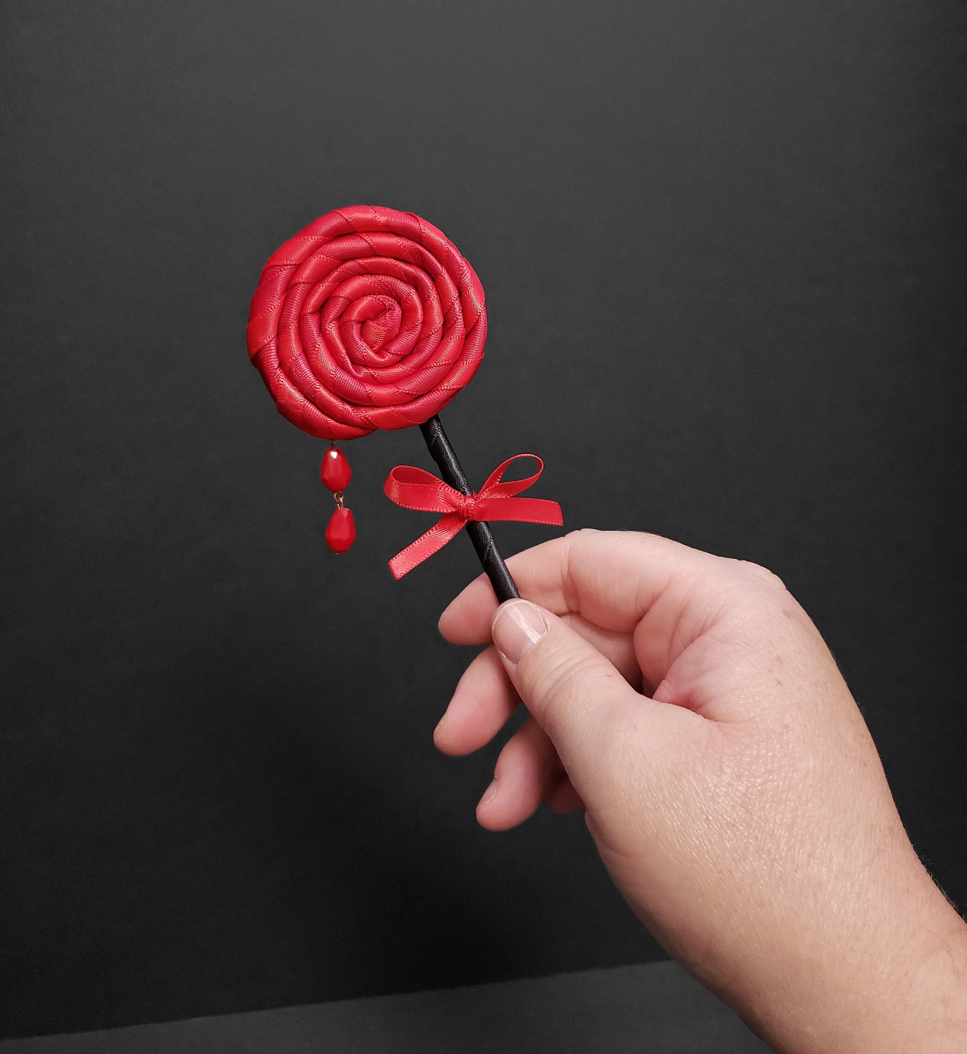 This is a vampire's lollipop hair clip or pin designed and made by me. It is made of two tones of hand wrapped red satin ribbon and finished with a red satin bow tied around a black satin wrapped stick. The lollipop is embellished with two blood drop crystals handsewn to the felted back. The piece can fasten with a pin, a hair clip, or both clip and pin!